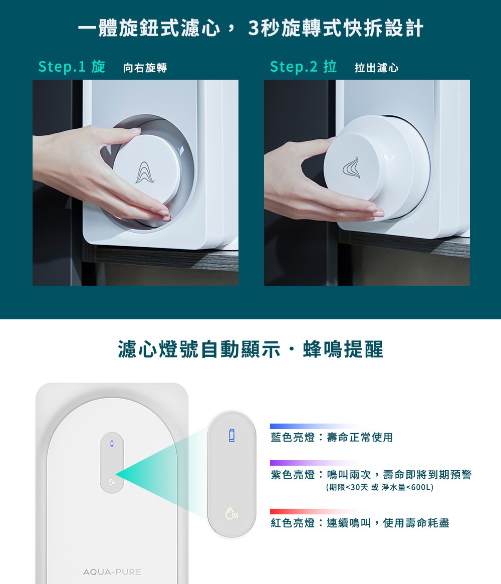 • 旋鈕式更換濾心,體積精巧,節省廚下空間 一旋二拉,兩步驟輕鬆換芯